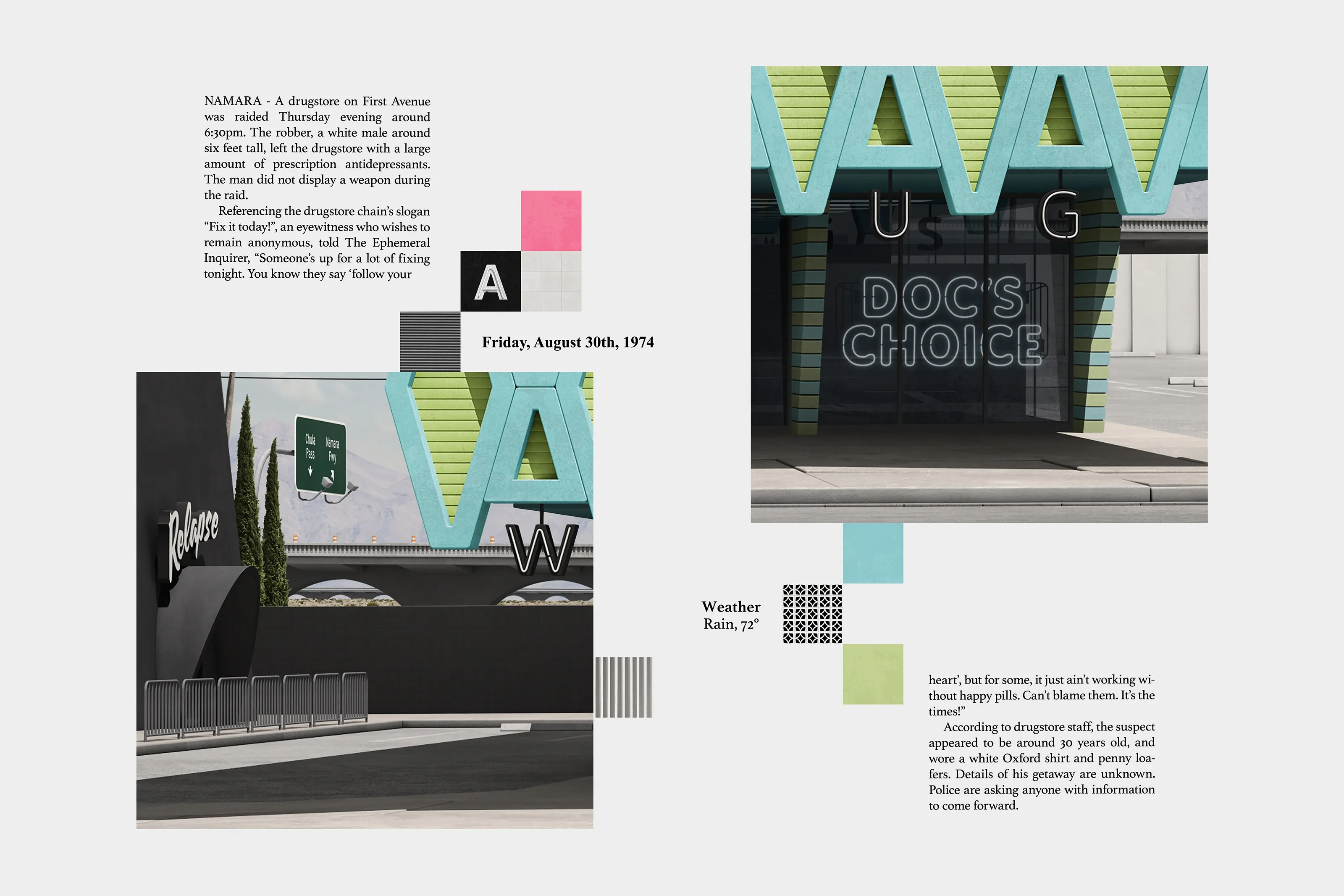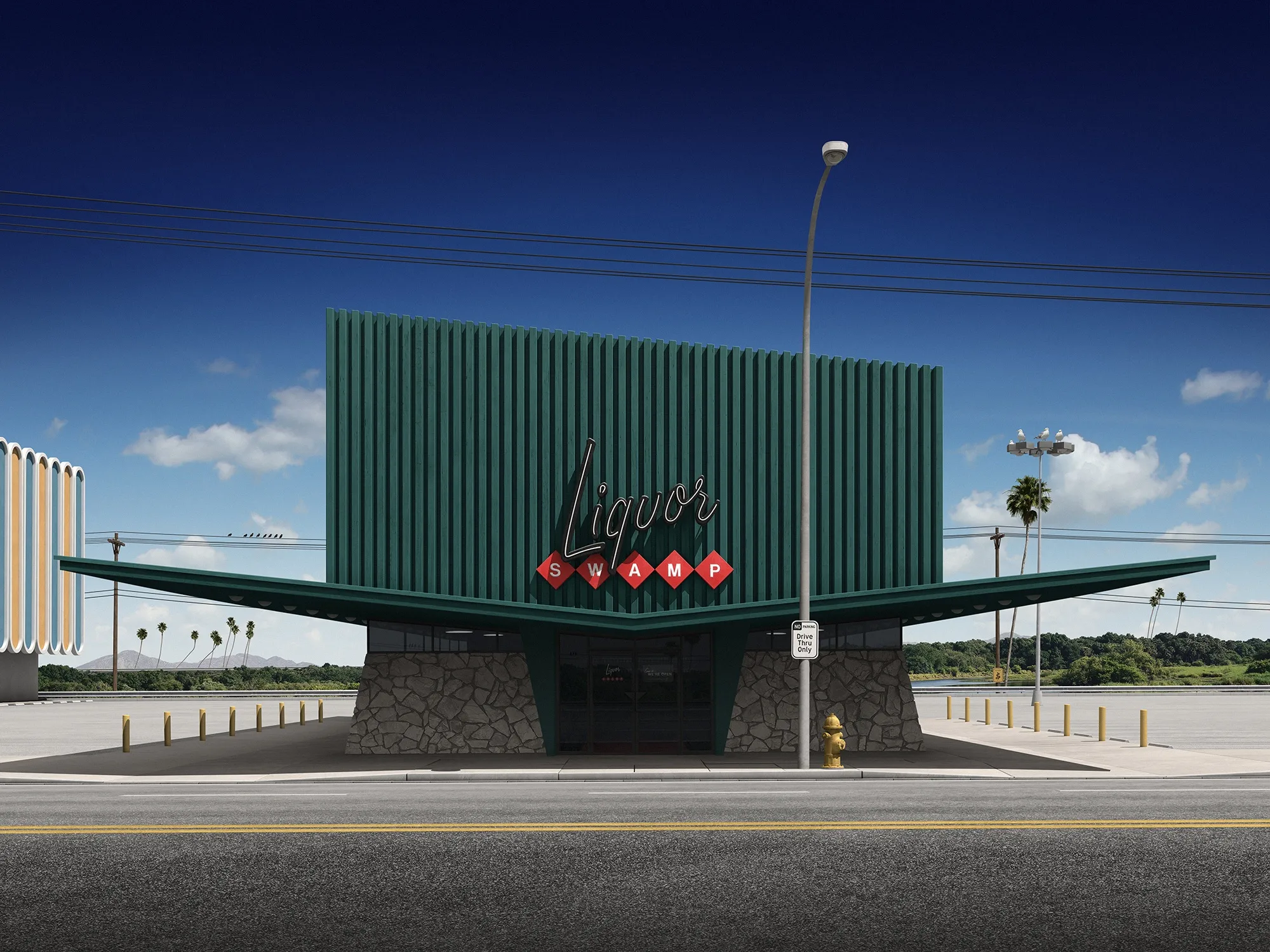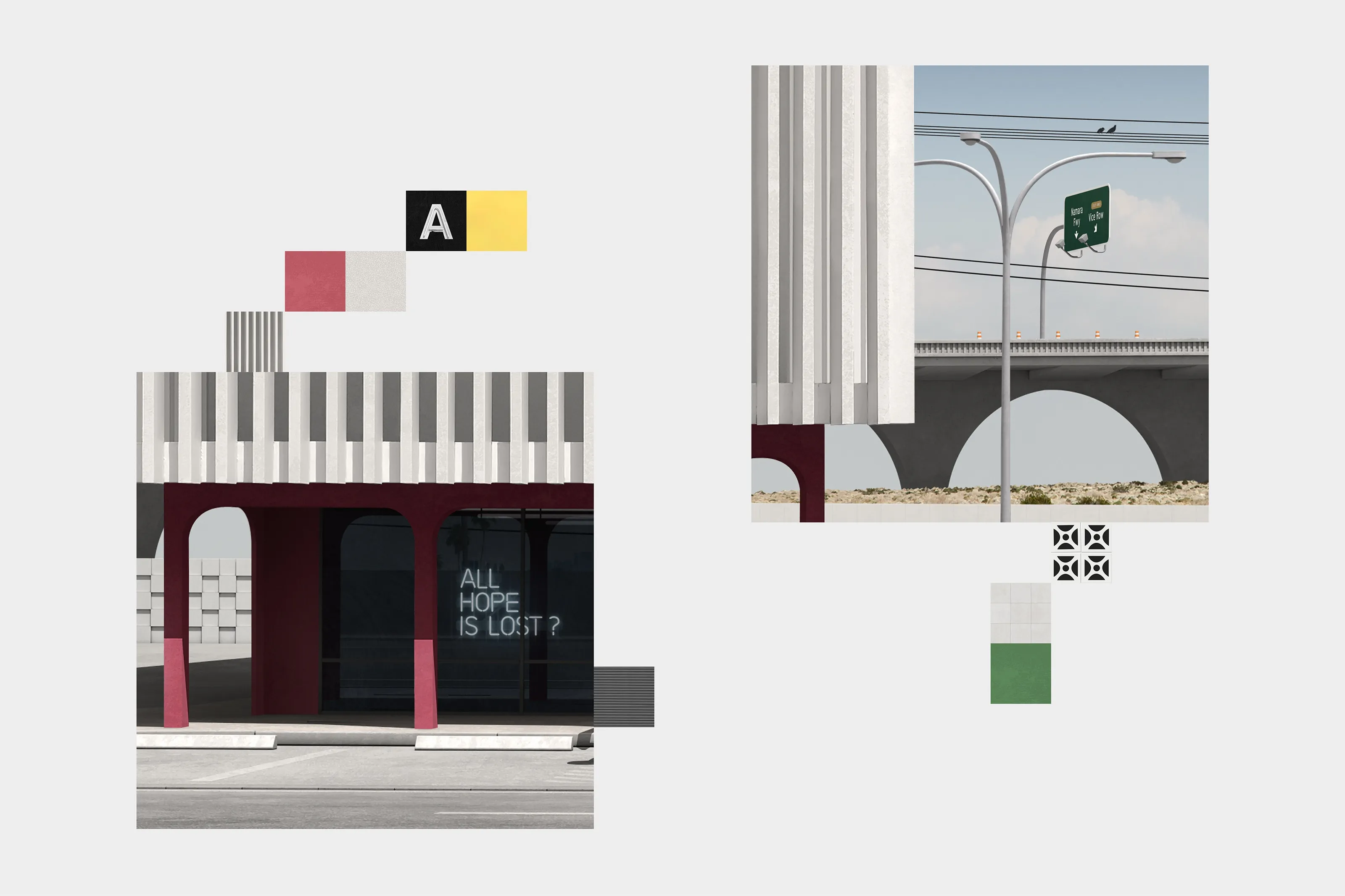 Through his imagined architecture, artist Robert G. Achtel subtly reflects upon existential human themes such as love, loss, sexuality, and addiction, while the confluence of the built environment and the natural create a seemingly idyllic, yet sardonic view of American consumer culture. The works are instantly arresting due to a unique photo-graphic design process, a meticulous hybrid of analog and digital methods, and their striking compositional continuity. For this presentation the artist has shared many of the source photographs used to construct each piece for the first time, providing an entertaining insight into his process and vision. Further background and biographic references can be found at the end of the presentation.